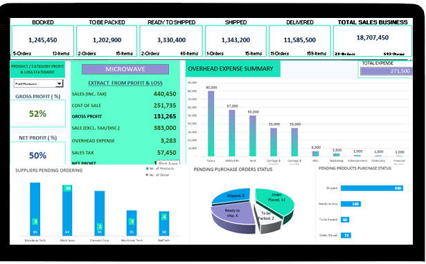 - Dynamic Dashboards: Displays key metrics like stock levels, sales, and profits.